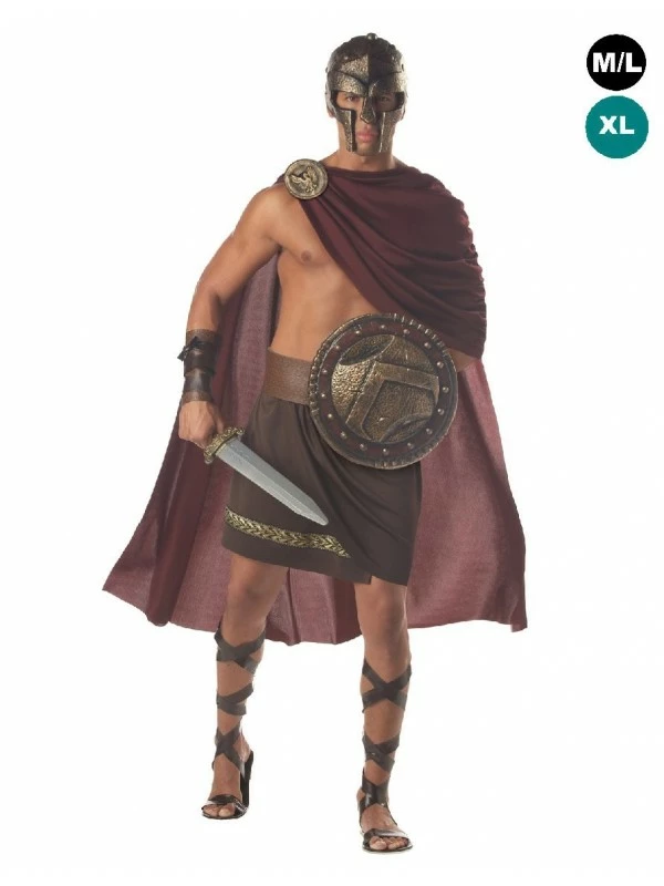 Entrez dans la peau d’un guerrier sparte et partez pour le champ de bataille ! Ce costume de très haute qualité comprend une cape marron qui s’enfile par la tête et qui est fixée à un médaillon en or, un kilt brun à placer autour de la taille où pour ajouter au confort nous avons placé un élastique, alors qu’un galon noir et or est cousu dans la partie basse. Vous profiterez aussi d’une ceinture et des poignets en simili cuir. Pour terminer votre préparation, il ne restera plus qu’ à enfiler le casque spartiate dont l’aspect usé renforce le côté emblématique de la tenue !